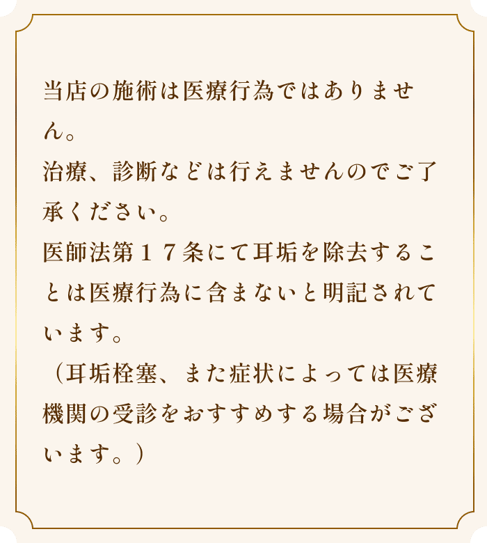 施術前に、耳の状態やご不安をお伺いします。 初めての方も安心してお過ごしいただけるよう、丁寧にお話をお聞きします。